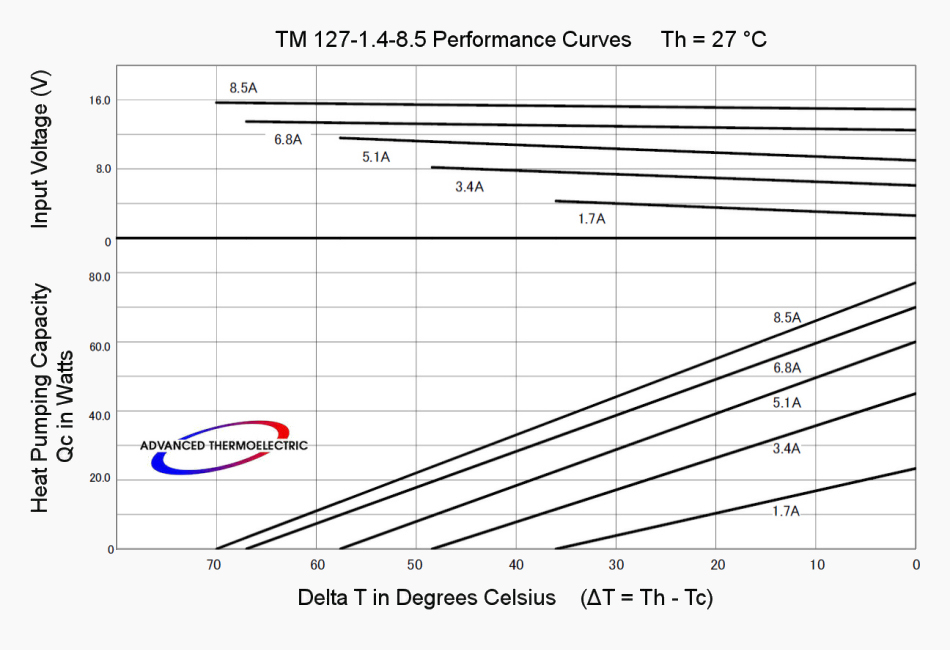 Curves with Th = 27 °C indicate what to expect operating a well designed, fan cooled, assembly in ambient temperatures around 20 °C (70 °F) with an operational "hot-side" temperature or Th about 7 °C above ambient.