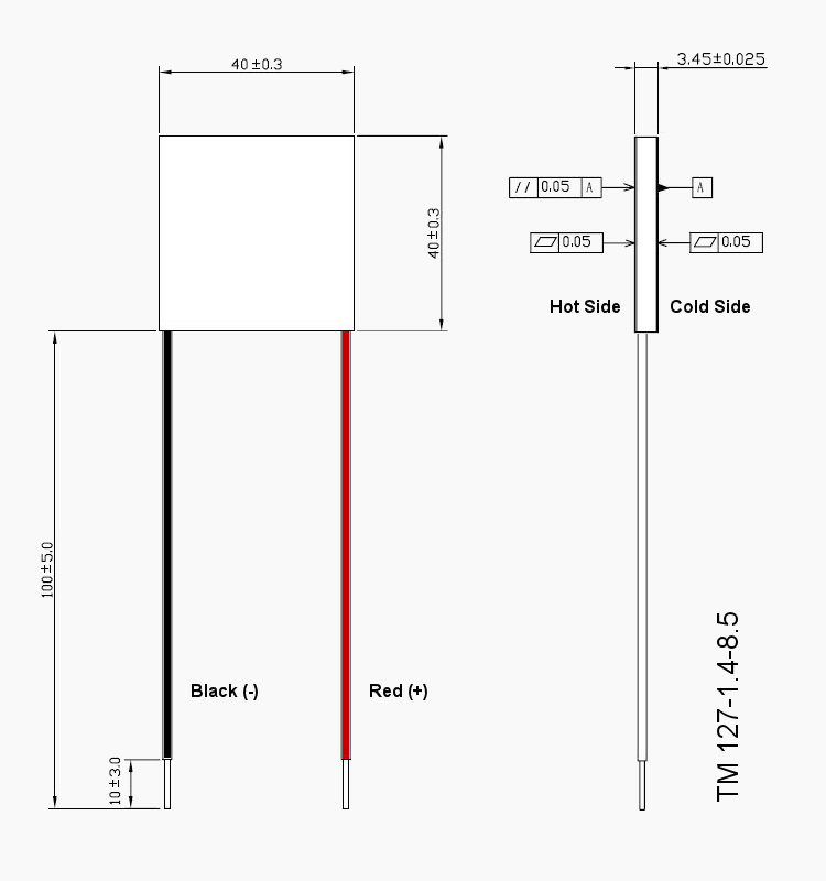 TM-127-1.4-8.5 is a general purpose workhorse. With 78 watts of cooling capacity, it’s our most powerful 40 x 40 mm single-stage thermoelectric module. Typically this module is powered by a 12V DC power source but can accommodate a 15V supply.