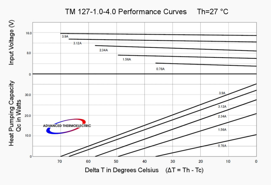 Curves with Th = 27 °C indicate what to expect operating in ambient temperatures around 20 °C (70 °F) with an operational "hot-side" temperature or Th about 7 °C above ambient.