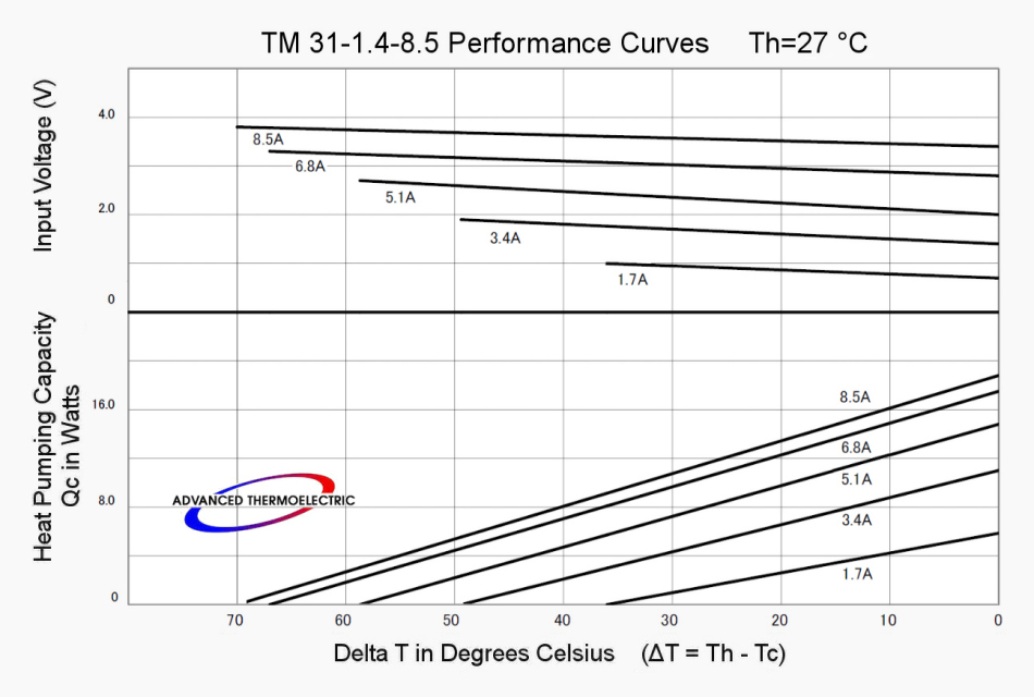 Curves with Th = 27 °C indicate what to expect operating in ambient temperatures around 20 °C (70 °F) with an operational "hot-side" temperature or Th about 7 °C above ambient.