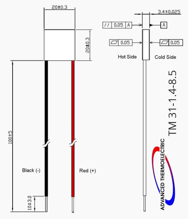 TM 31-1.4-8.5 is a general purpose single-stage thermoelectric module, with exceptional cooling capacity for a module powered by a 3.3V DC power source. With a 20 x 20 mm footprint and the (Qcmax) of 18.8 watts, it’s a great choice when voltage is limited and current is abundant.