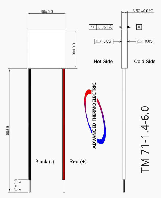 TM 71-1.4-6.0 is a popular multi-purpose single-stage thermoelectric module with a 30 x 30mm footprint. Typically used with 5 to 8 Volt DC power sources.