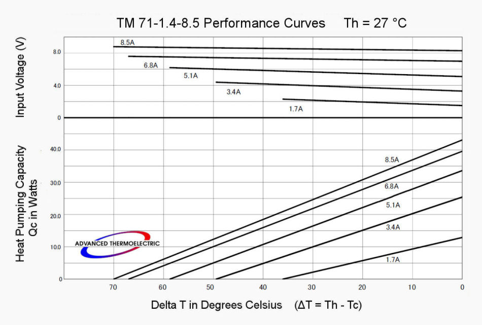 Curves with Th = 27 °C indicate what to expect operating in ambient temperatures around 20 °C (70 °F) with an operational "hot-side" temperature or Th about 7 °C above ambient.