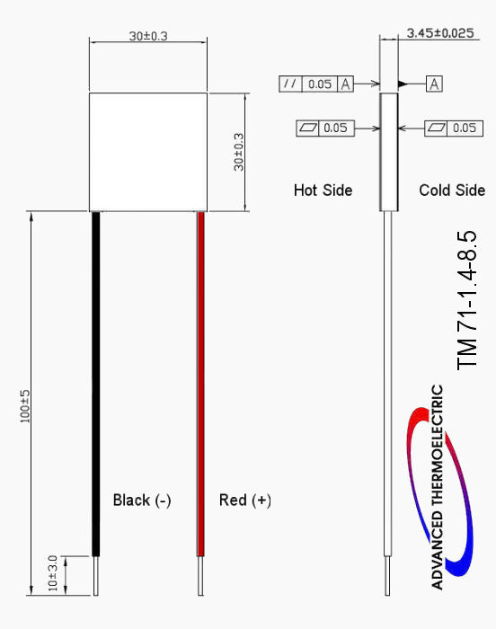 TM 71-1.4-8.5 is a popular multi-purpose single-stage thermoelectric module with a 30 x 30mm footprint. Typically used with 5 to 8 Volt DC power sources and with a robust 42 Watts of cooling capacity it’s powerful. Move more heat or shorten transient times... Frequently used in strings, when it's desirable to increase the temperature controlled surface area, when higher voltages are available. (2 @ 12V, 4 @ 24V, 8 @ 48V, etc.)