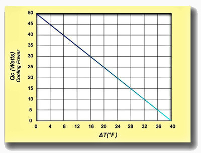 When cooling below ambient is desirable, the capacity in watts or Btu/hour decreases as the exchanger works to provide colder temperatures. See the performance curve for a particular unit to see how many watts can be extracted at a given temperature drop.