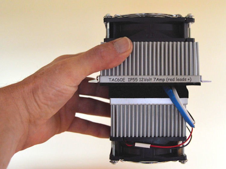 The heart of the system is one or more thermoelectric modules. The cold-side of the module is connected to a heat sink with a fan (forced convection) that absorbs heat from within the enclosure and circulates the cooled air. The warm or "hot-side" of the module is connected to another forced convection heat sink that dissipates the heat, absorbed through the cold side as well as the input power to the module/s, to ambient.